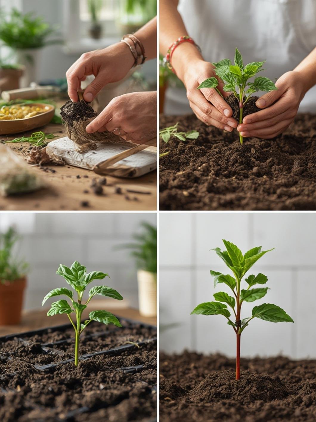 • Siembra estratégica: Para semillas, haz hoyos del doble de su tamaño. Si usas plántulas, riega antes de transplantar para mantener las raíces húmedas y firmes.