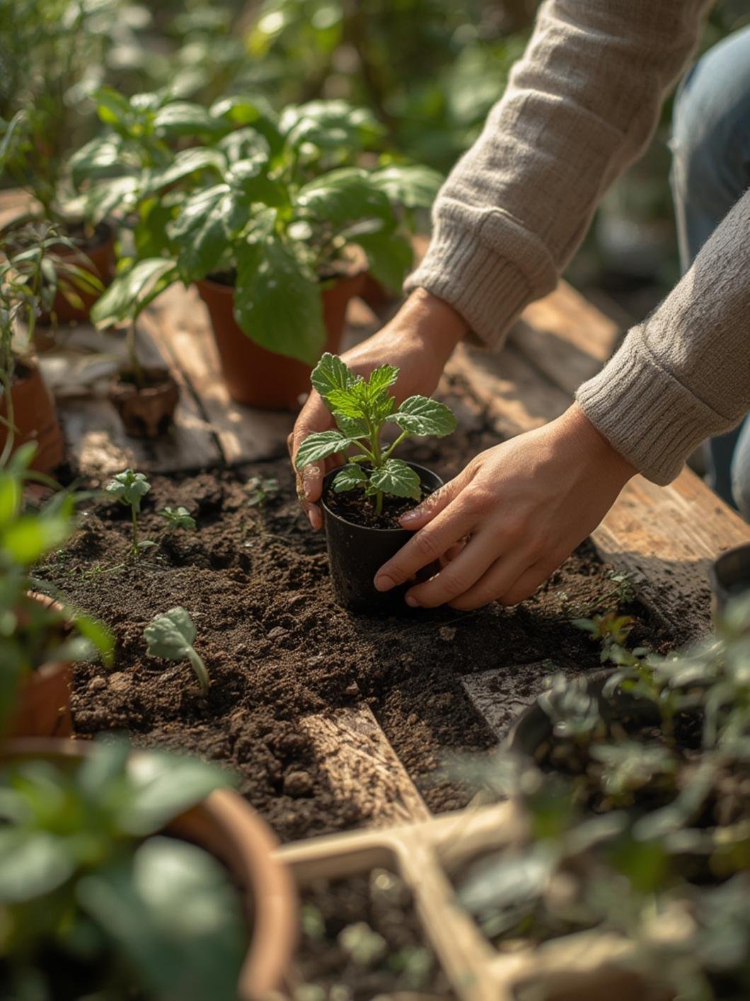 • Prepara los contenedores: Llena macetas con sustrato hasta 2 cm del borde. Añade 1 puñado de abono por cada 10 cm de profundidad.